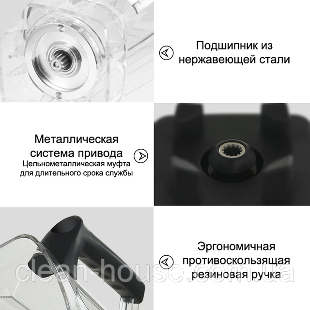 Велика ємність чаші: 2-х літрова пластикова чаша зручна, легка і міцна. Його перевернутий трапецієподібний дизайн дозволяє задовольнити особисті та сімейні потреби. Легко миється, просто налийте в миску теплої води і додайте трохи рідкого мила, після увімкніть блендер на кілька секунд - і готово.